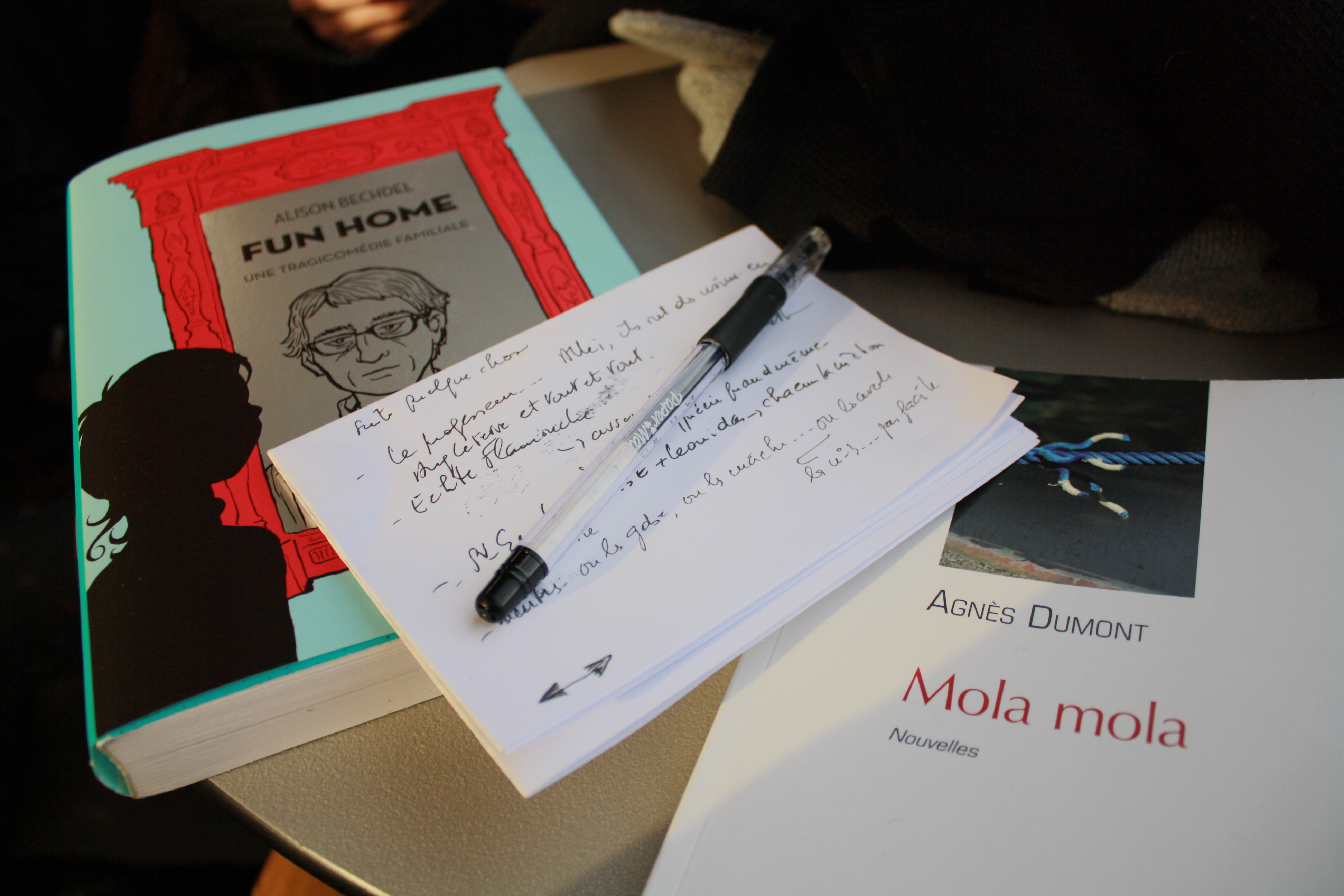 Les voix parlent en français. L’une, flamande. L’autre, drôle de timbre. On dirait une petite fille avec un accent un peu français, un peu flamouche. Sauf que c’est pas une petite fille du tout. Mais ça, on ne le sait pas encore parce qu’on ne les voit pas. Sauf que… Sauf qu’il y a de la place derrière les deux voix. On les voit toujours pas, on se retrouve dos à dos.