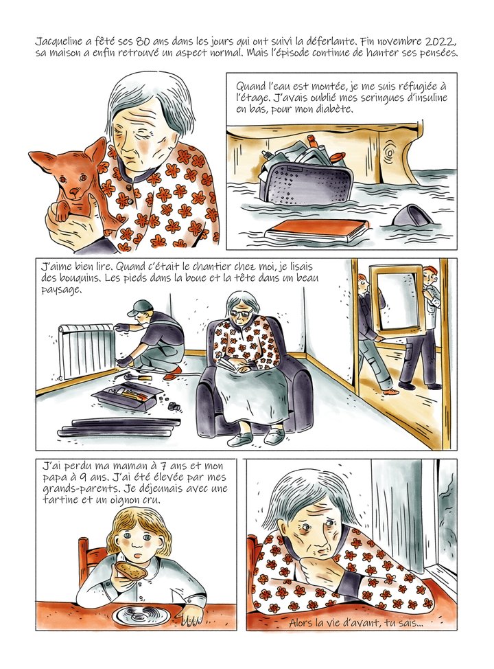 Reportage sur les inondations de 2021 illustré par Delphine Hermans, Michel Vandam ayant fait partie d’un groupe de psys bénévoles à Chênée pendant une douzaine de mois.